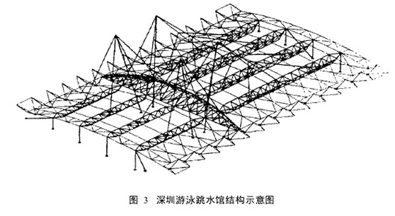 從表2所列工程可以看出,浙江黃龍體育中心體育場為我國目前跨度較大的斜拉網殼,兩塔柱間的距離達250米,每塊月牙形網殼上弦面上巧妙地設置了九道穩(wěn)定索以抵抗向上的風荷載,見圖2。太舊高速公路舊關收費站為我國首次采用獨塔式全方位布索的斜拉網殼。深圳市游泳跳水館采用了由縱橫向立體桁架系、四根桅桿及十六根斜拉鋼棒(其中四根又各再分為三根)組合的雜交空間結構,見圖3。這些都表明我國的斜拉空間網格結構采用了較多的新技術,取得了長足的發(fā)展。