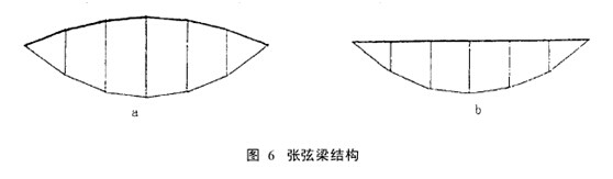 張弦梁結(jié)構(gòu)是最近幾年發(fā)展起來的大跨度鋼結(jié)構(gòu),它可用于屋蓋結(jié)構(gòu),見圖6a,也可用于樓層結(jié)構(gòu)見圖6b,還可用于墻體結(jié)構(gòu)(如玻璃幕墻的立柱)。