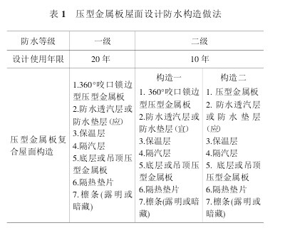 壓型金屬板屋面系統(tǒng)包括壓型鋼板屋面、壓型鋁合金板屋面等,其防水構(gòu)造做法見表1.