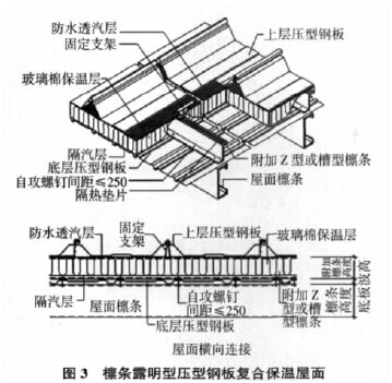 有檁體系——檁條露明型壓型鋼板復(fù)合保溫屋面系統(tǒng)(圖 3)系統(tǒng)特點:雙層壓型鋼板均放置在屋面檁條上,在底層壓型鋼板上加設(shè)附檁或?qū)S弥Ъ埽佋O(shè)保溫層并固定上層壓型鋼板,襯檁固定要確保穩(wěn)固,高度要滿足保溫棉的厚度不被壓縮。